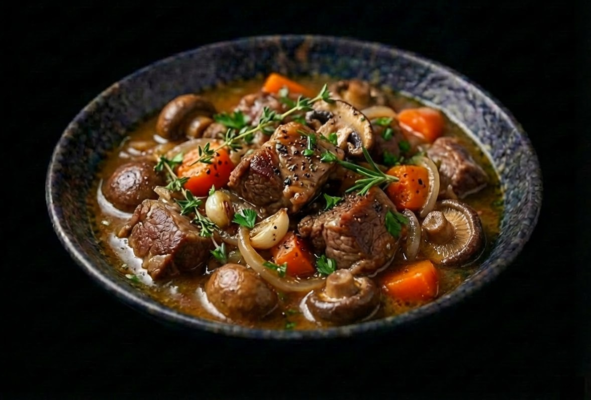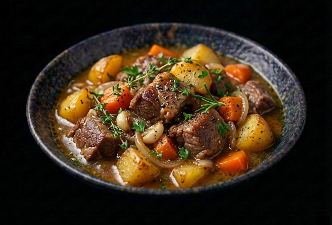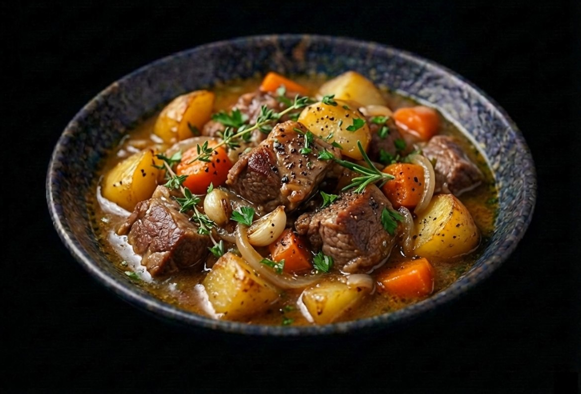 Жаркое из нежной говядины с золотистым картофелем и ароматными травами. Простое блюдо с богатым, глубоким вкусом. Для настоящих гурманов.